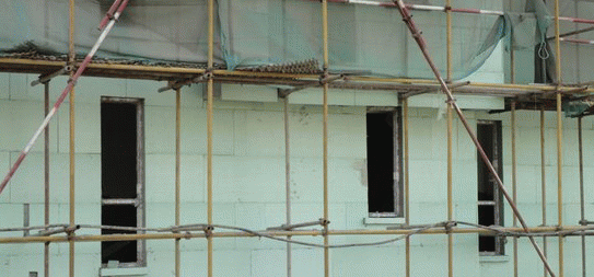 5)、用抹子在每塊擠塑板周邊涂50mm 寬專用聚合物粘結(jié)砂漿,要求從邊緣向中間逐漸加厚,最厚處達(dá)10mm;注意在擠塑板的下側(cè)留設(shè)50mm寬的槽口,以利于貼板時(shí)將封閉在板與墻體間的空氣溢出。然后再在擠塑板上抹8 個(gè)厚10mm φ100 的圓形聚合物粘結(jié)砂漿灰餅6)、用條點(diǎn)法涂好聚合物砂漿的擠塑板必須立即粘貼在墻面上,速度要快,以防止粘結(jié)砂漿表面結(jié)皮而失去粘結(jié)作用。條點(diǎn)發(fā)涂抹聚合物粘結(jié)砂漿時(shí),粘貼時(shí)不允許采用使板左右、上下錯(cuò)動(dòng)的方式調(diào)整預(yù)粘貼板與已貼板間的平整度,而應(yīng)采用橡膠錘敲擊調(diào)整;目的是防止由于擠塑板左右錯(cuò)動(dòng)而導(dǎo)致聚合物粘結(jié)砂漿溢進(jìn)板與板間的縫隙內(nèi)。